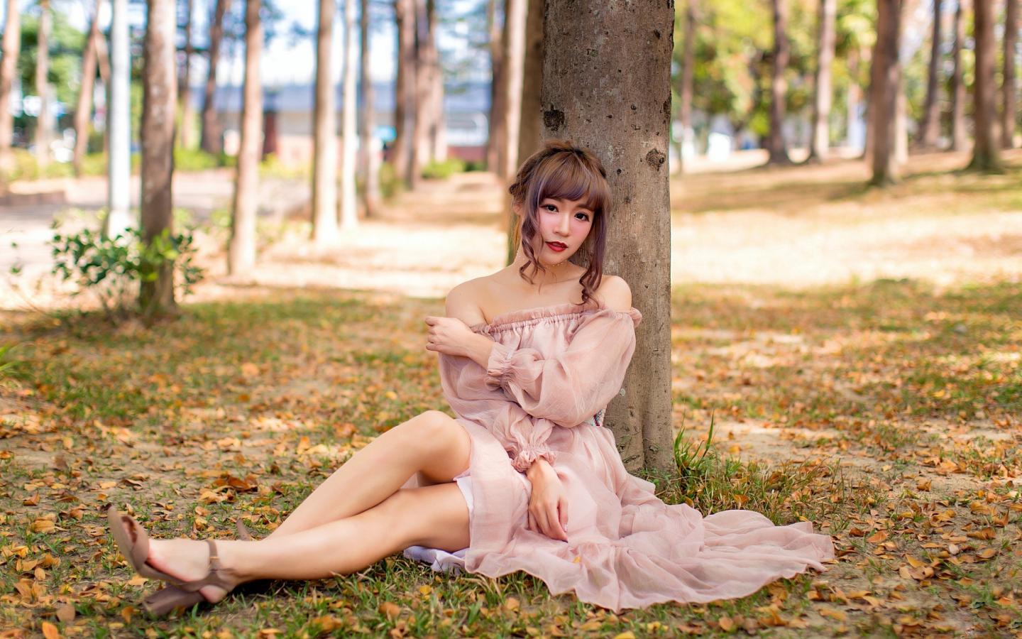 Обои Красивая девушка азиатка в платье сидит под деревом