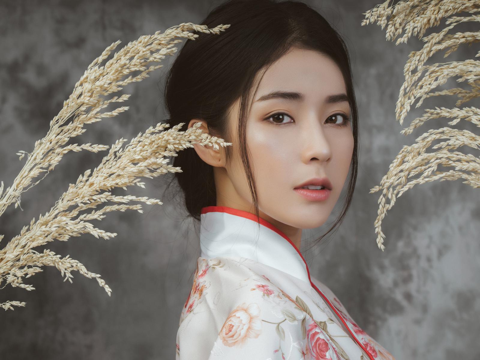 Обои Девушка азиатка в кимоно на фоне с колосьями