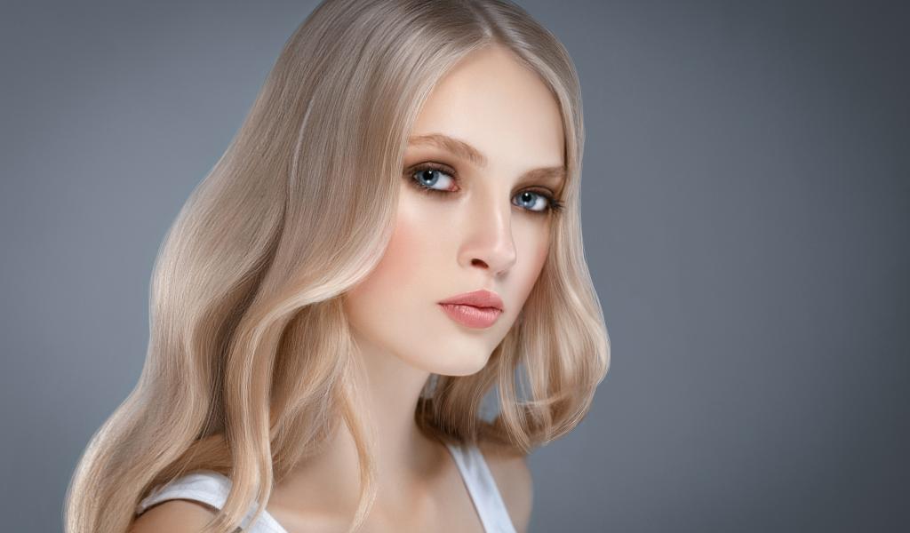 Обои Красивая нежная голубоглазая блондинка на сером фоне
