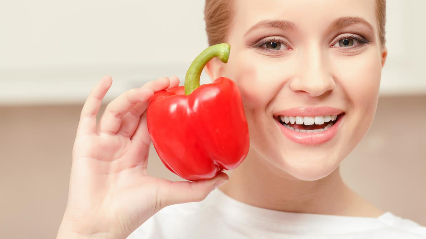 Обои Улыбающаяся девушка с красным сладким перцем в руке