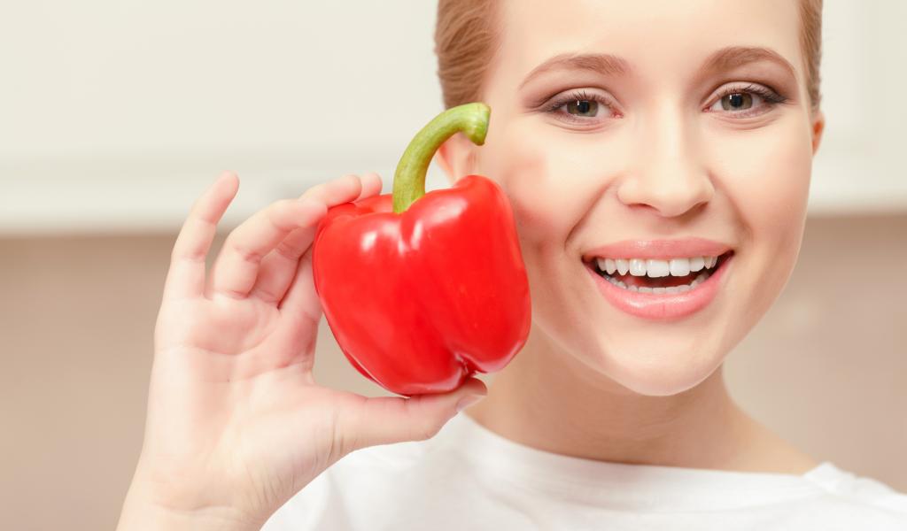 Обои Улыбающаяся девушка с красным сладким перцем в руке