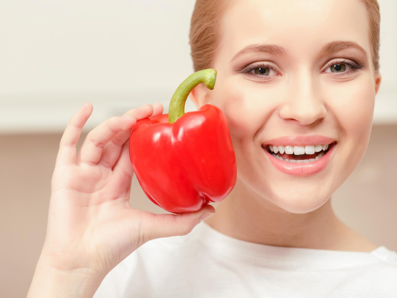 Обои Улыбающаяся девушка с красным сладким перцем в руке
