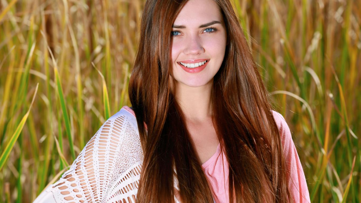 Обои Улыбающаяся голубоглазая шатенка на поле