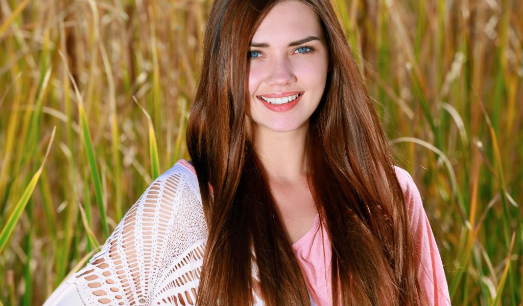 Обои Улыбающаяся голубоглазая шатенка на поле