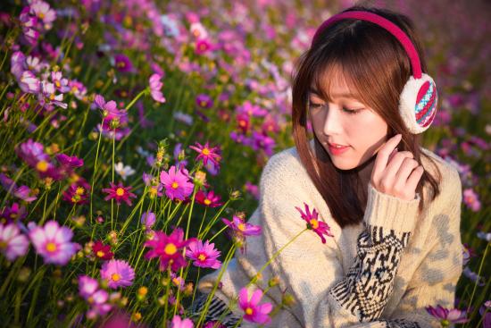 Обои Девушка азиатка в наушниках сидит в цветах космеи