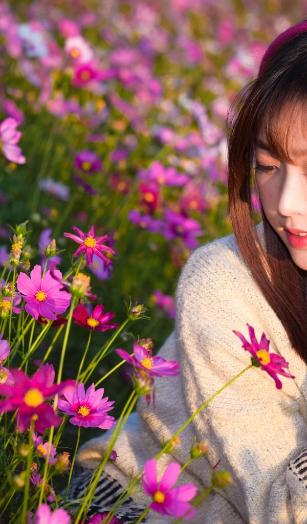 Обои Девушка азиатка в наушниках сидит в цветах космеи