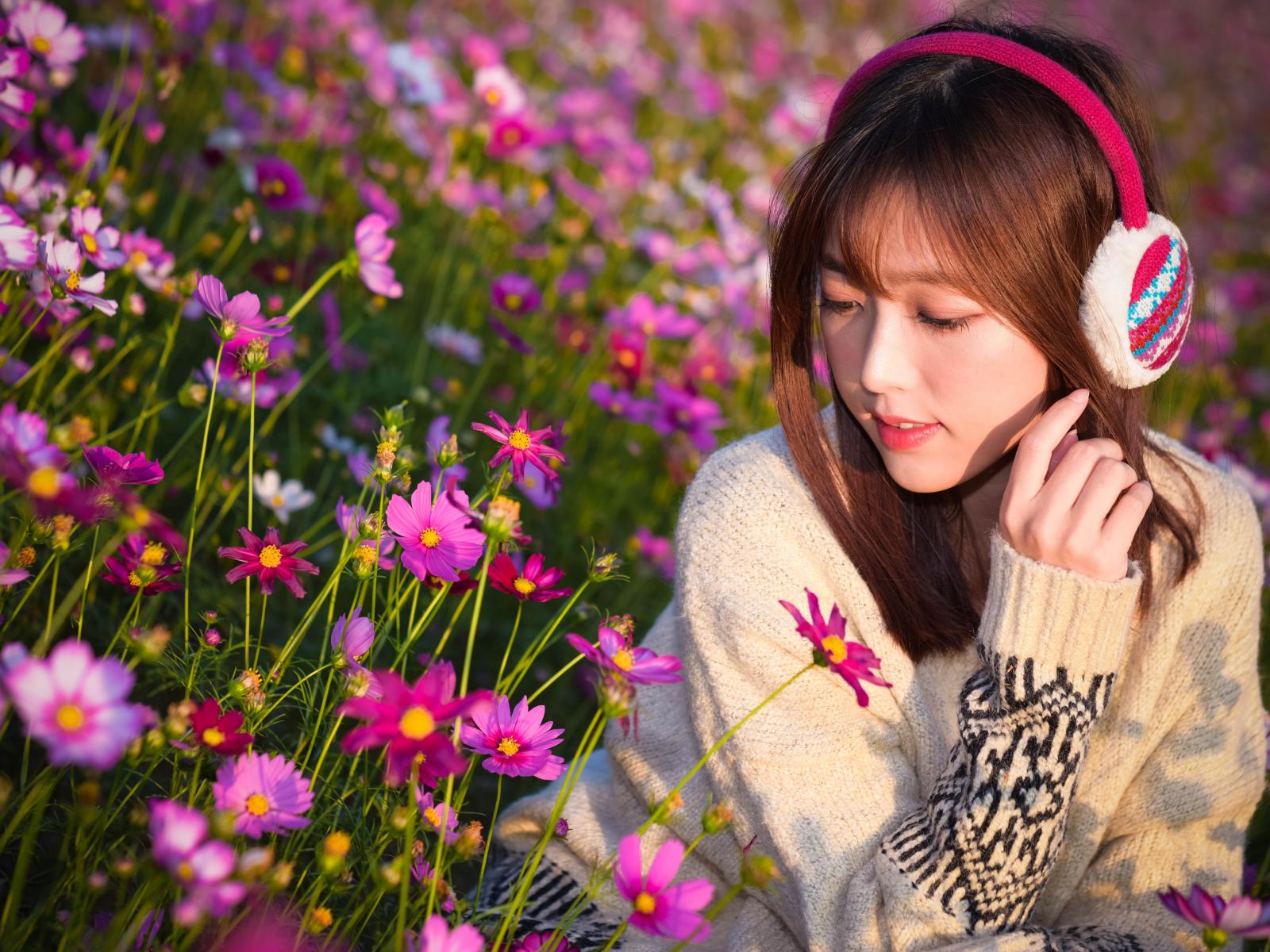 Обои Девушка азиатка в наушниках сидит в цветах космеи