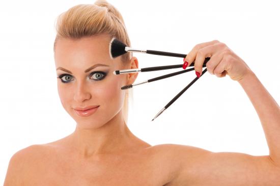 Обои Красивая девушка с кистями для макияжа на белом фоне