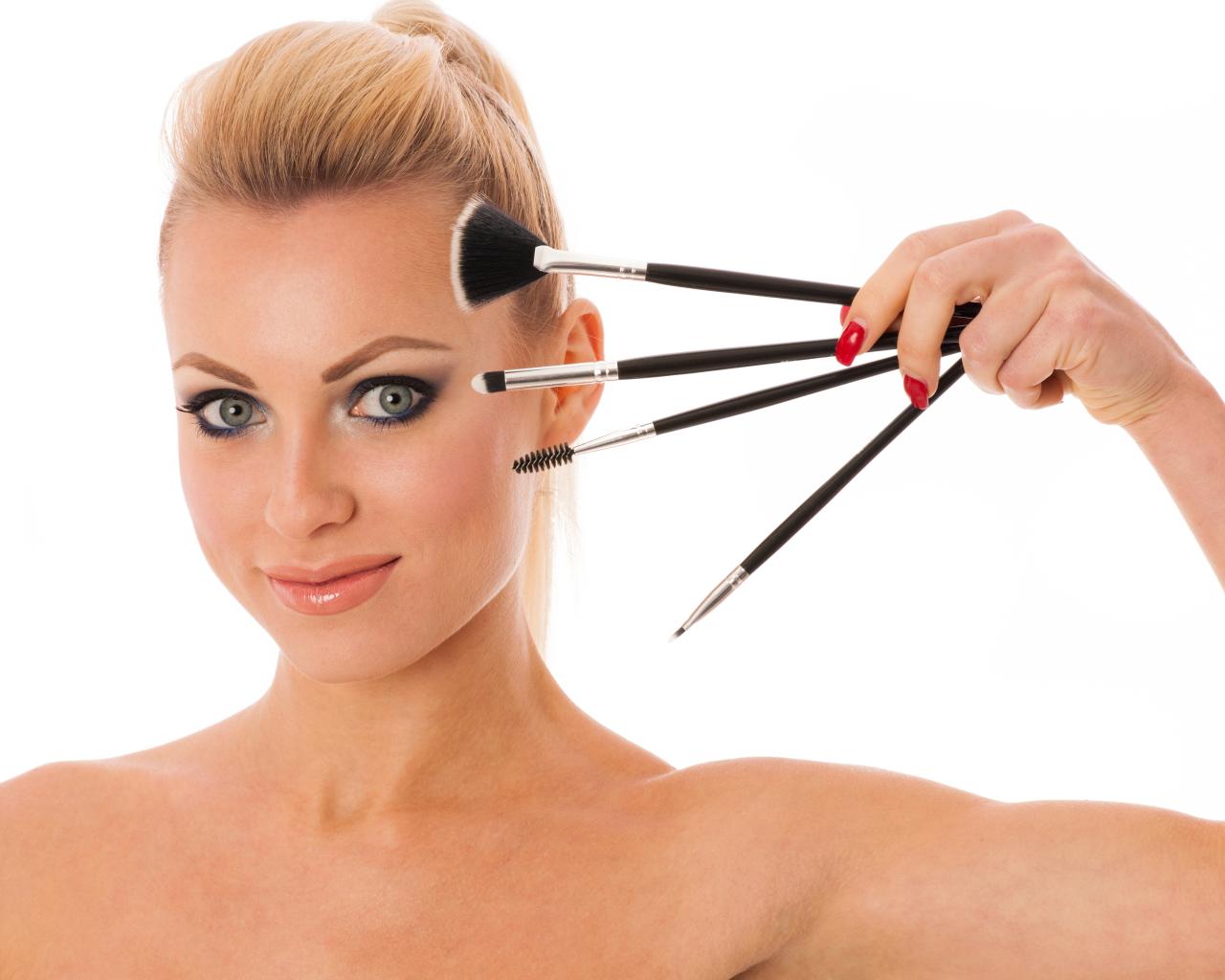 Обои Красивая девушка с кистями для макияжа на белом фоне