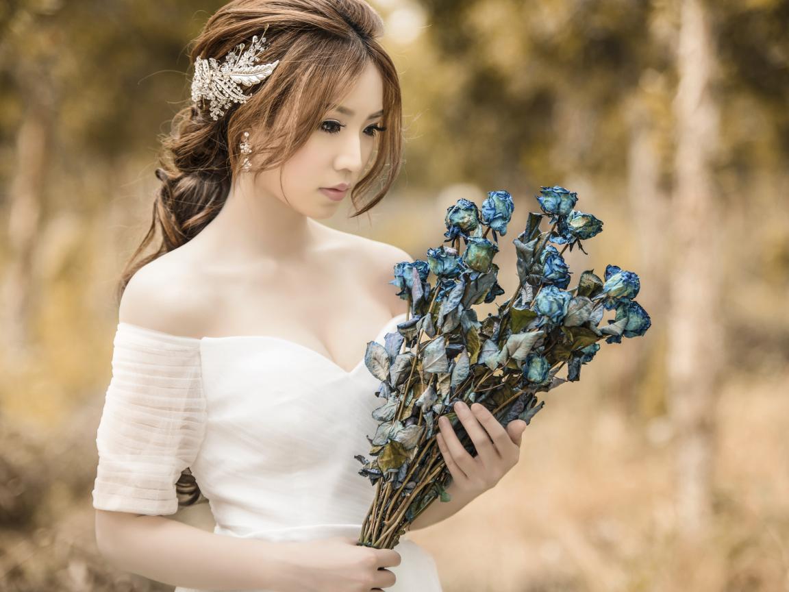 Обои Девушка азиатка невеста с букетом сухих роз