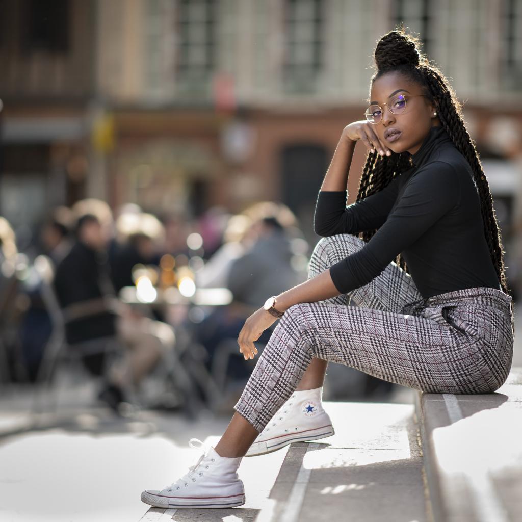 Обои Красивая темнокожая девушка сидит на ступеньках