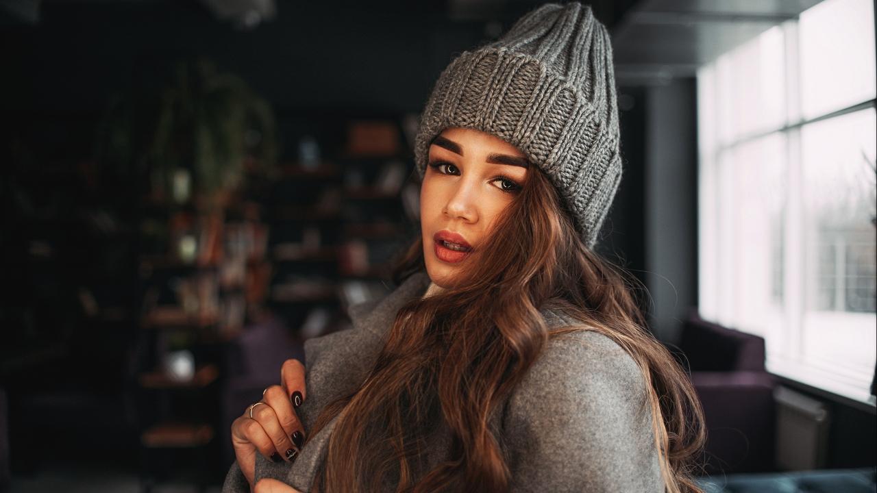 Обои Красивая молодая девушка в пальто в вязаной шапке