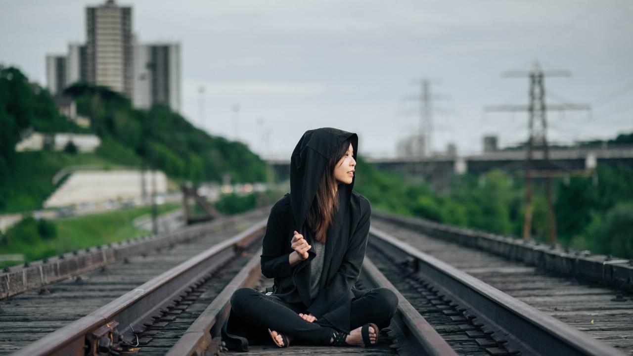 Обои Девушка азиатка в черном балахоне сидит на рельсах
