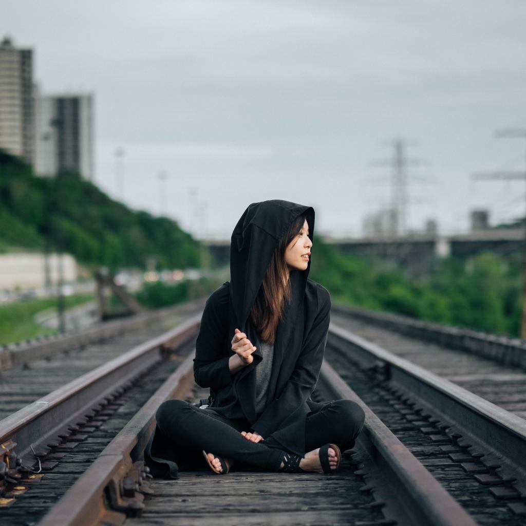 Обои Девушка азиатка в черном балахоне сидит на рельсах