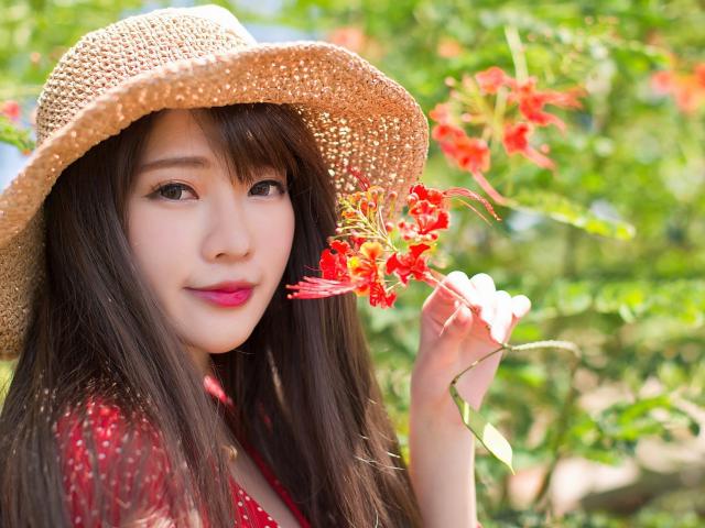 Обои Девушка азиатка в шляпе с красным цветком