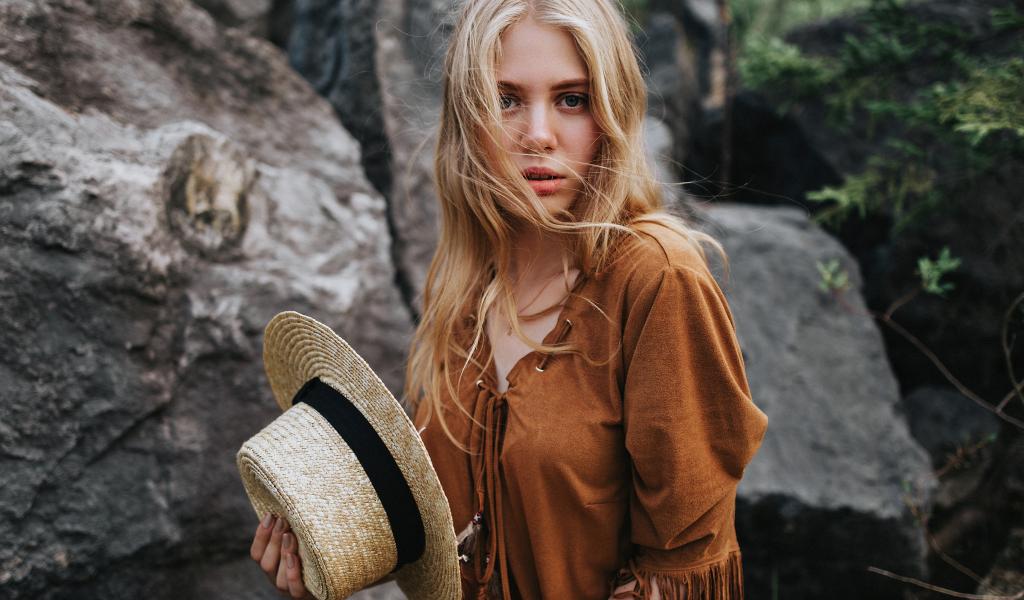 Обои Блондинка со шляпой в руках стоит у камней
