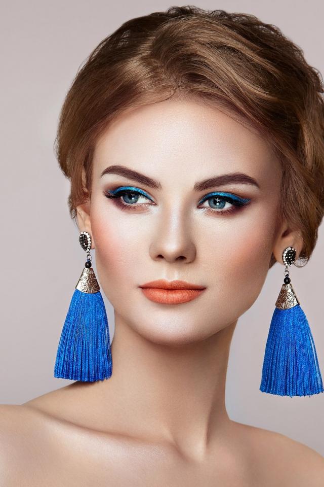 Обои Красивая девушка с синими сережками на сером фоне