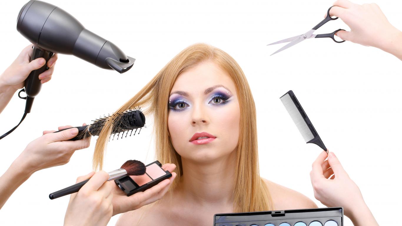 Обои Девушке делают макияж и прическу на белом фоне