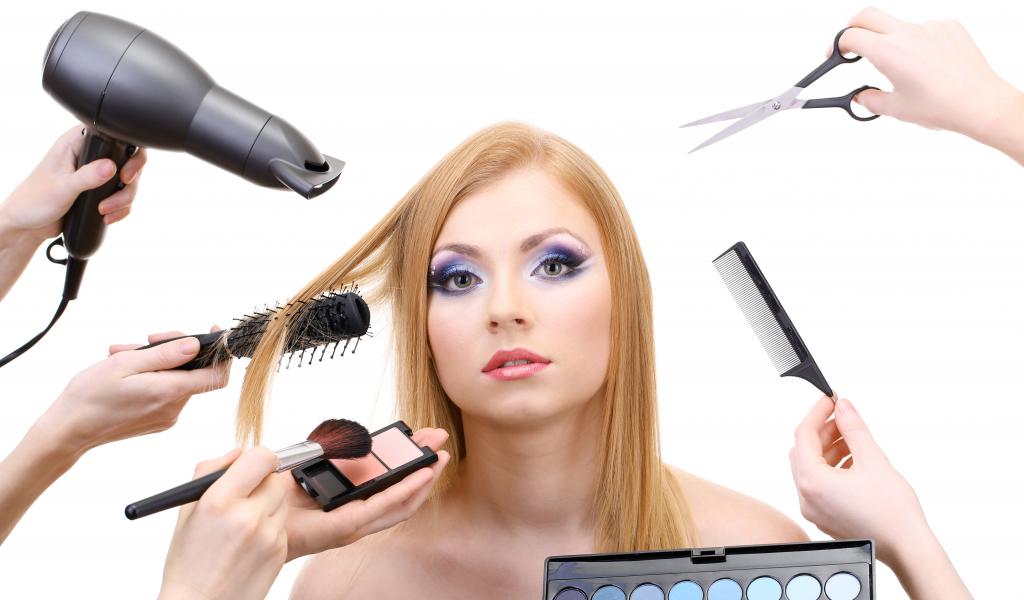 Обои Девушке делают макияж и прическу на белом фоне