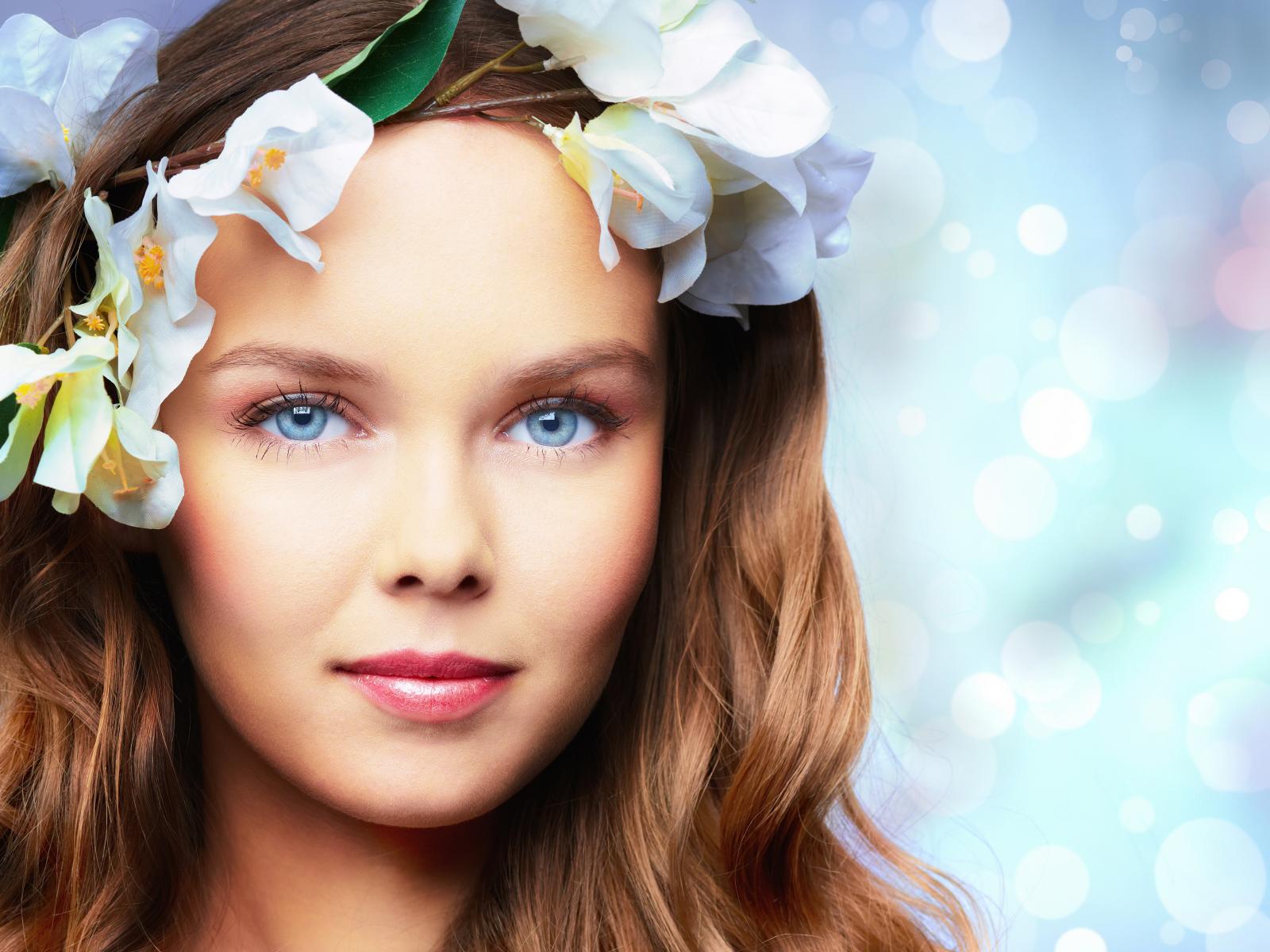 Обои Нежная голубоглазая девушка с цветами в волосах