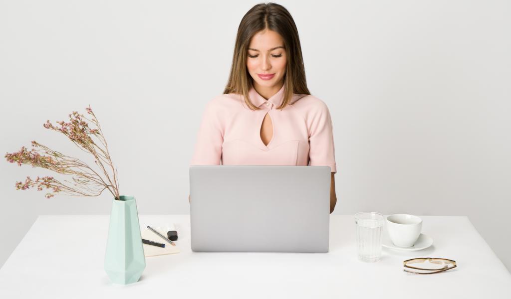 Обои Умная девушка за ноутбуком на сером фоне