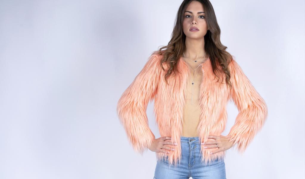 Обои Красивая девушка в розовой шубе и джинсовых шортах