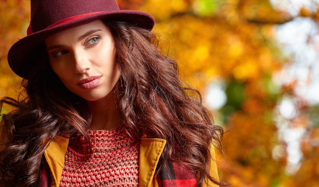 Обои Красивая длинноволосая девушка в шляпе осенью