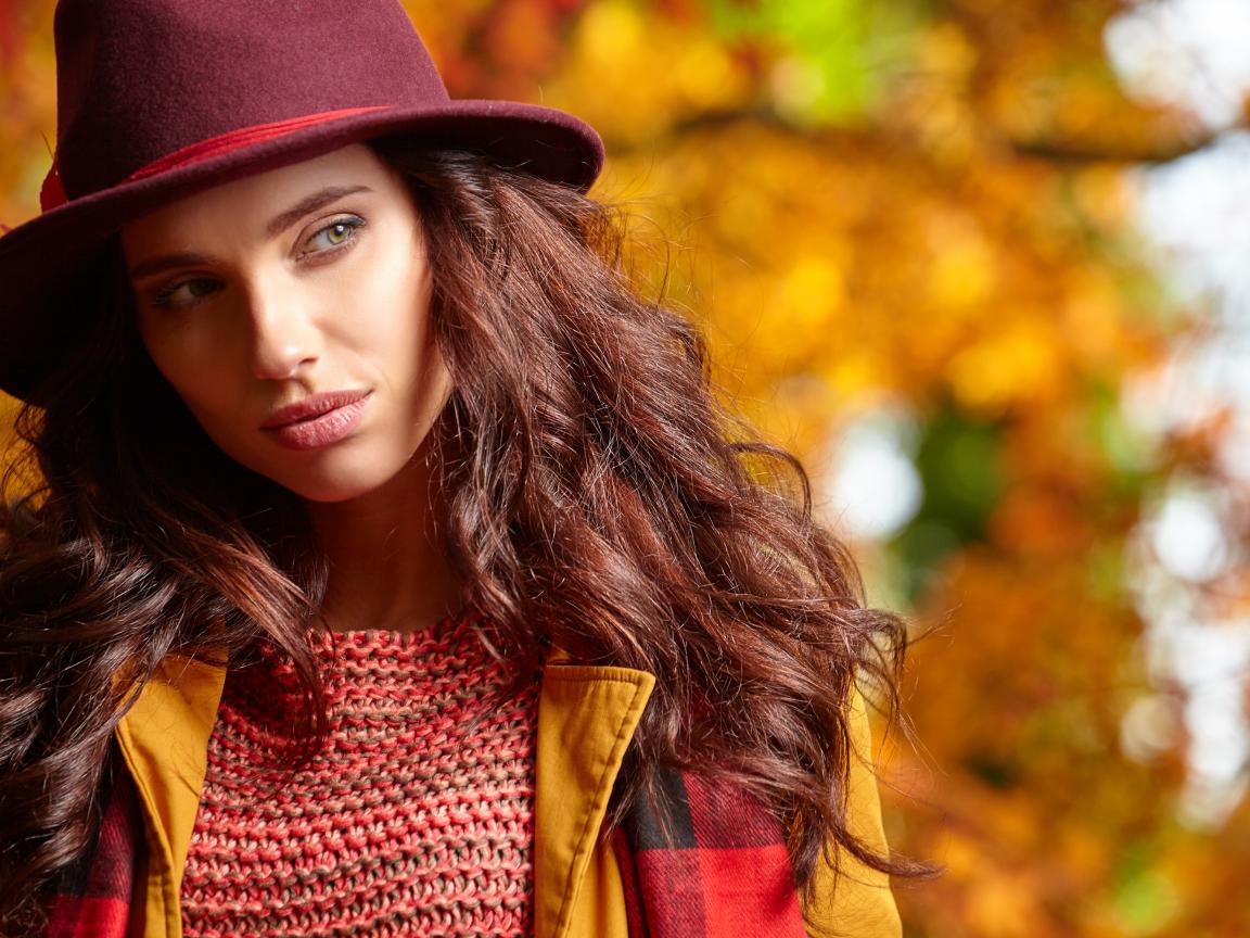 Обои Красивая длинноволосая девушка в шляпе осенью