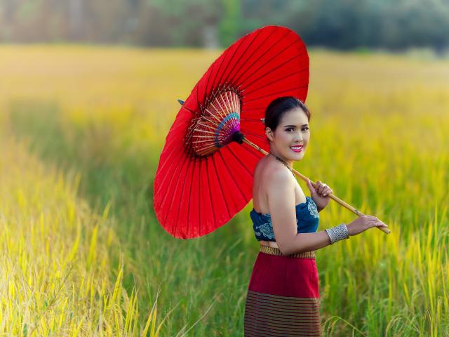 Обои Улыбающаяся девушка азиатка с красным зонтом