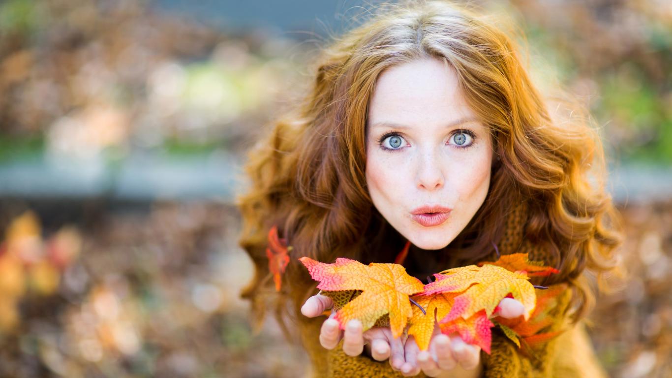 Обои Красивая девушка сдувает листья с ладоней
