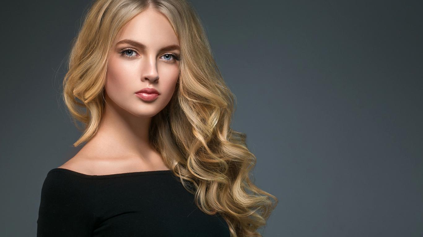 Обои Длинноволосая блондинка с голубыми глазами на сером фоне