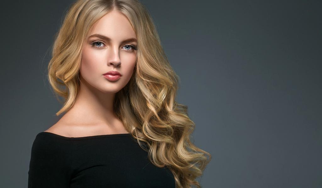 Обои Длинноволосая блондинка с голубыми глазами на сером фоне