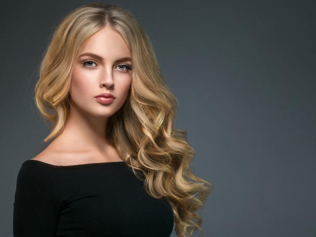 Обои Длинноволосая блондинка с голубыми глазами на сером фоне