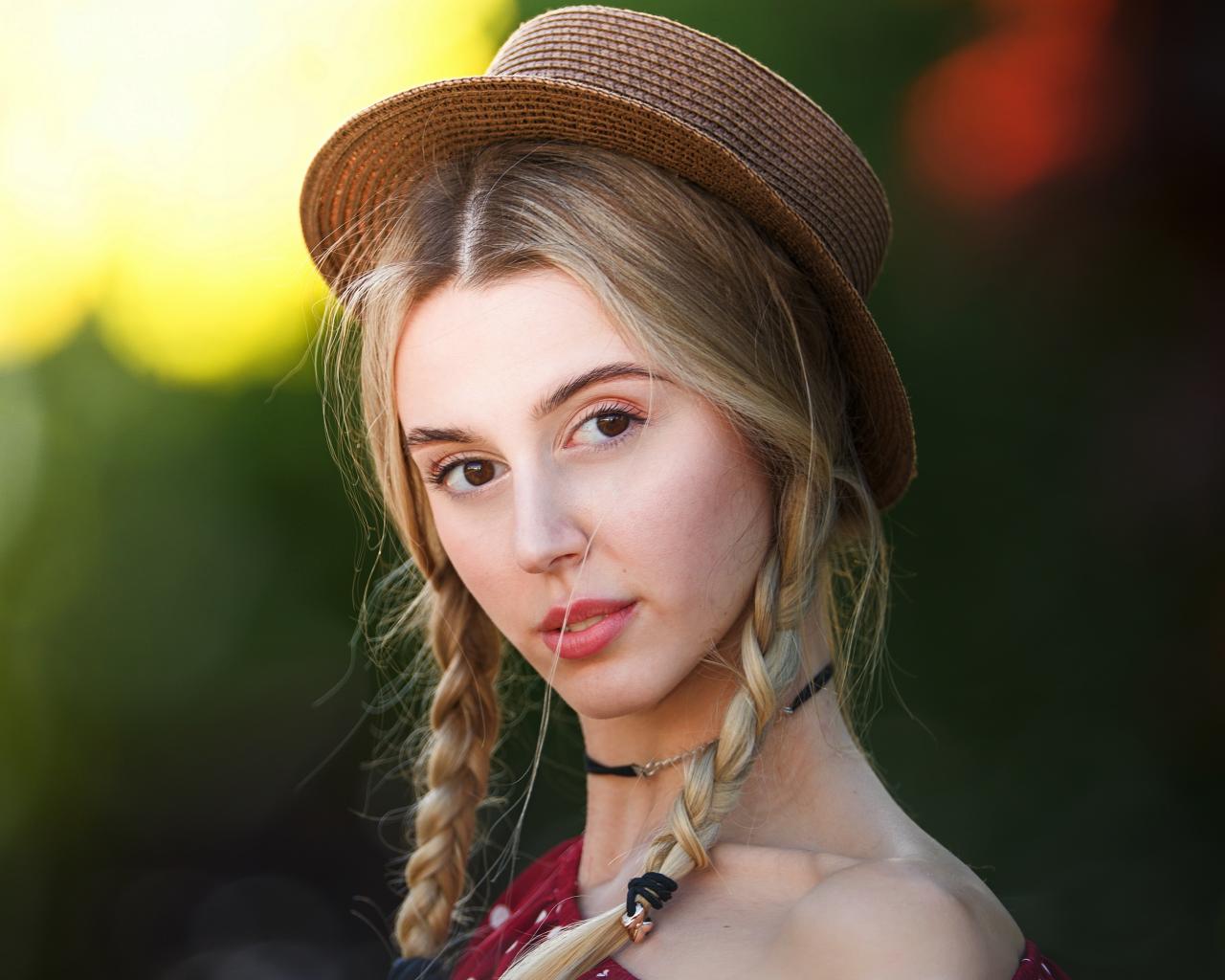 Обои Кареглазая девушка с косами на голове в шляпе