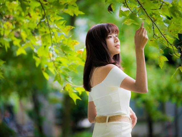 Обои Нежная девушка азиатка прикасается к листу на дереве