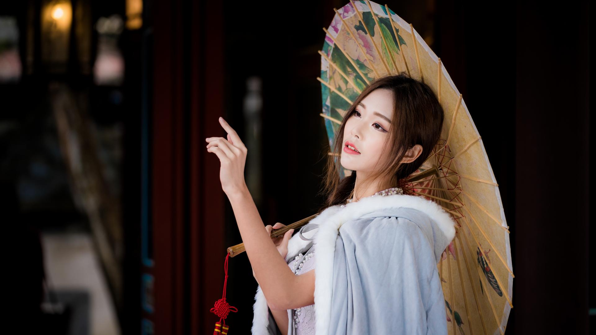 Обои Нежная азиатка с зонтиком в руках