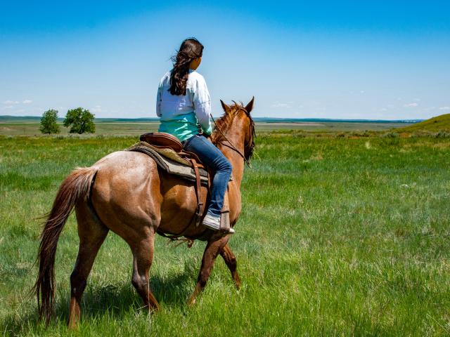 Обои Молодая девушка едет на лошади по зеленой траве