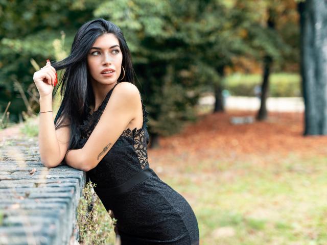 Обои Красивая брюнетка в черном платье в парке