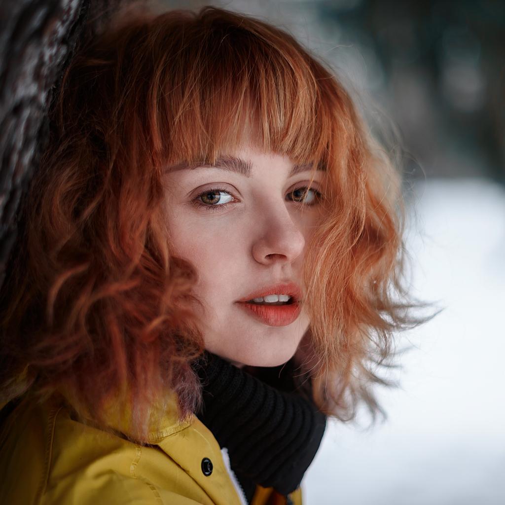 Обои Красивая рыжеволосая девушка стоит у дерева зимой