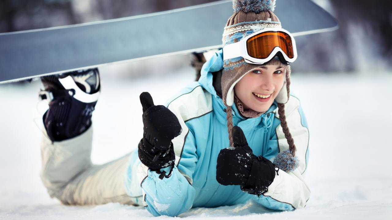 Обои Улыбающаяся девушка сноубордистка на снегу зимой