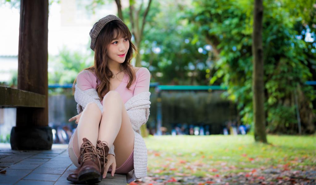 Обои Красивая девушка азиатка сидит на земле