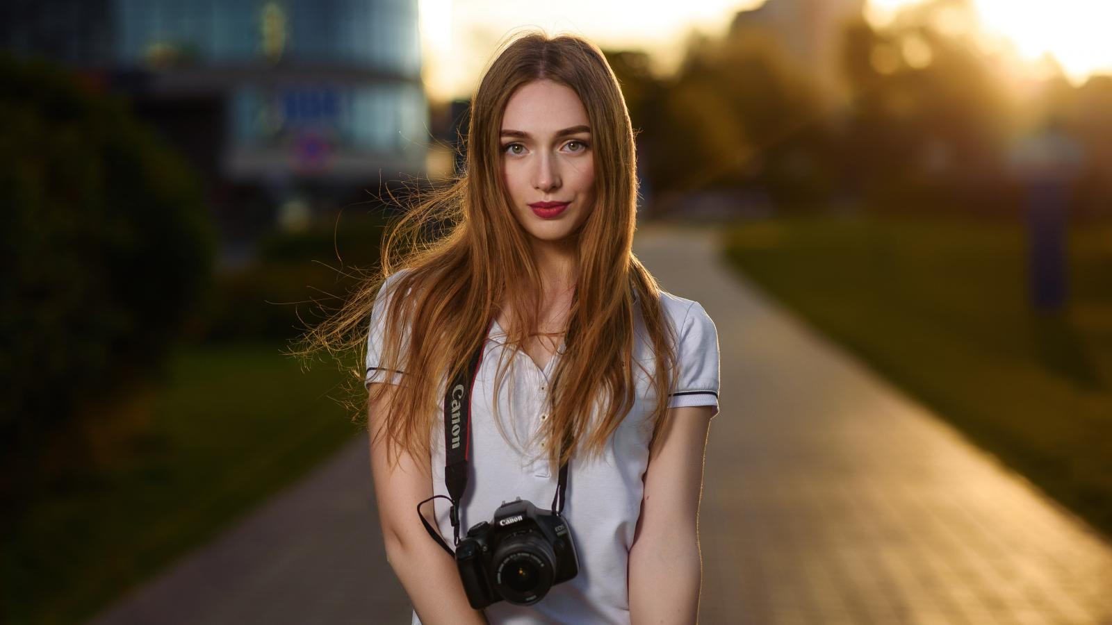 Обои Красивая длинноволосая девушка с фотоаппаратом