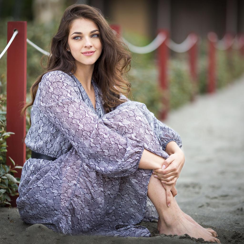 Обои Красивая девушка в платье сидит на песке
