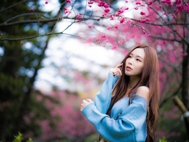 Обои Красивая длинноволосая азиатка у дерева сакуры