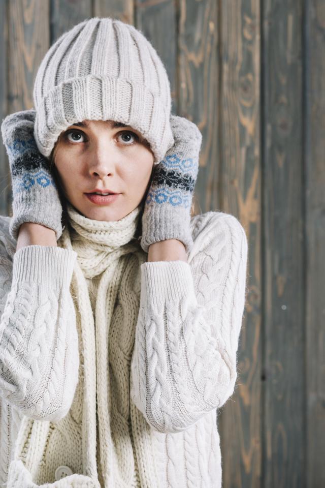 Обои Девушка в варежках поправляет шапку на голове