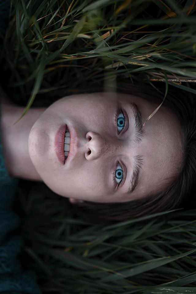 Обои Голубоглазая девушка в свитере лежит на траве