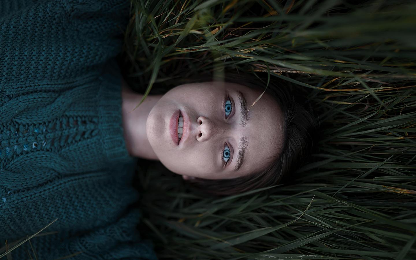 Обои Голубоглазая девушка в свитере лежит на траве