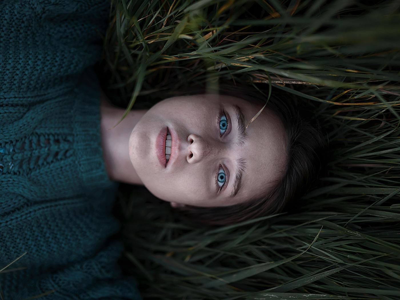 Обои Голубоглазая девушка в свитере лежит на траве