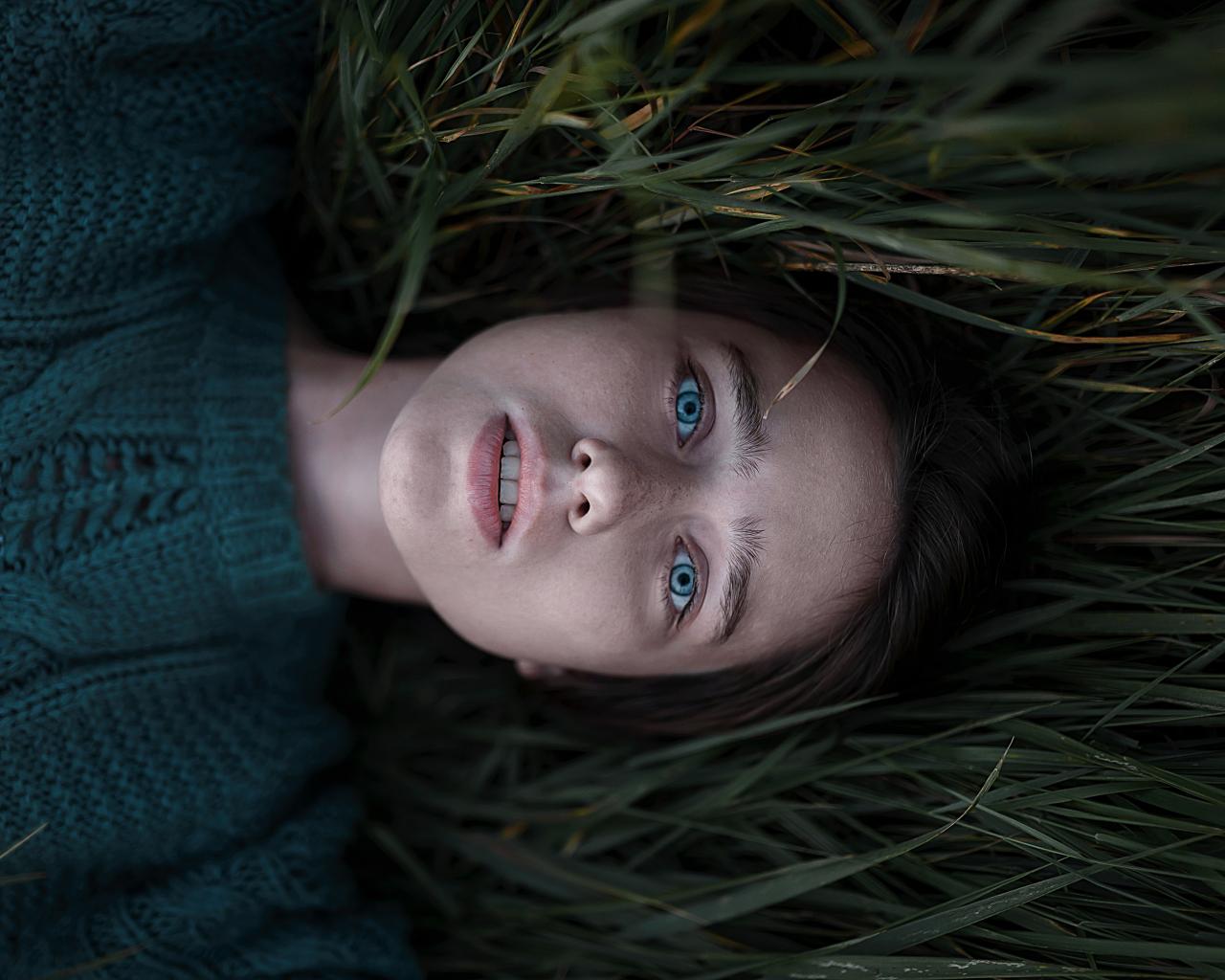Обои Голубоглазая девушка в свитере лежит на траве