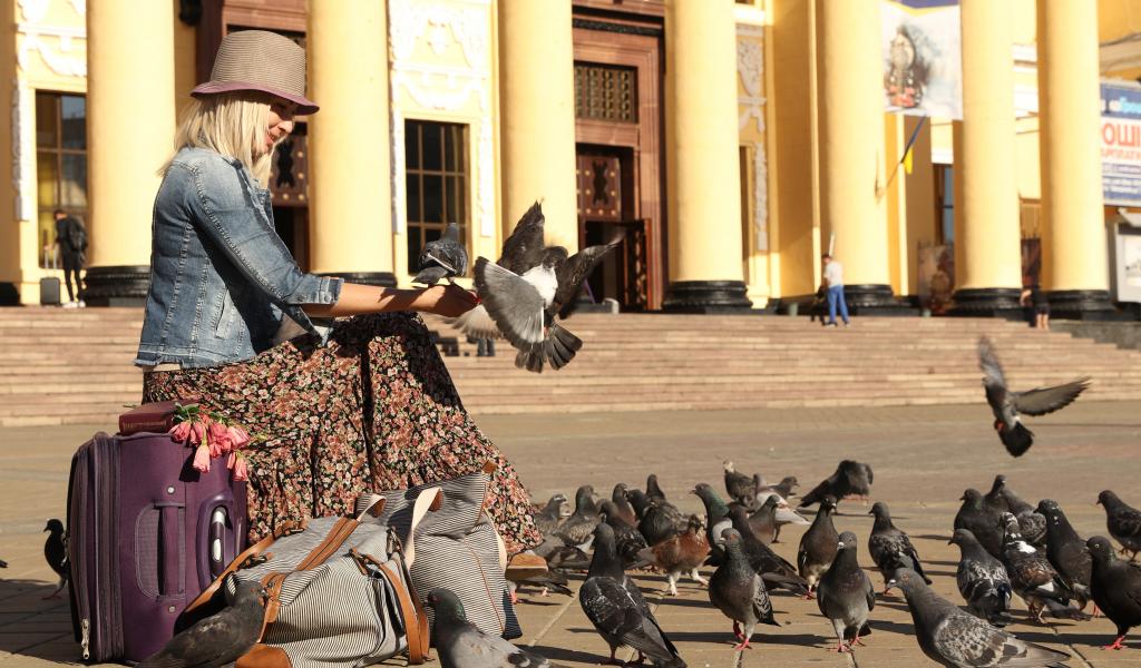 Обои Молодая девушка кормит голубей на вокзале